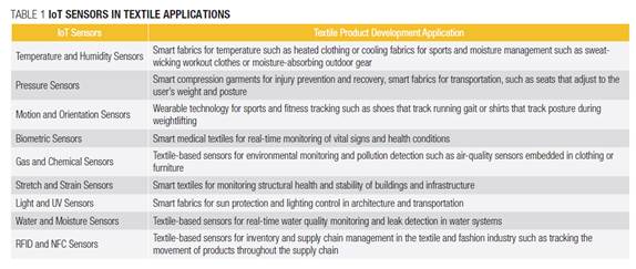 Table 1 shows some examples of IoT sensors and their applications in textile product development.