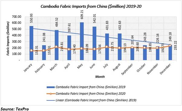 Also, the input materials for the manufacturing of garments had been impacted significantly, especially imports from China. The Cambodian fabric imports from China declined by 50.18 per cent in 2020 to $2,296.77 million from $4,610.09 million in 2019. It suddenly dropped in January 2020 and February 2020. The Cambodian yarn imports from China declined by 14.47 per cent in 2020 to $188.33 million from $220.18 million in 2019. The Cambodian fibre imports from China declined by 22.31 per cent in 2020 to $4,016.93 million from $5,170.53 million in 2019.