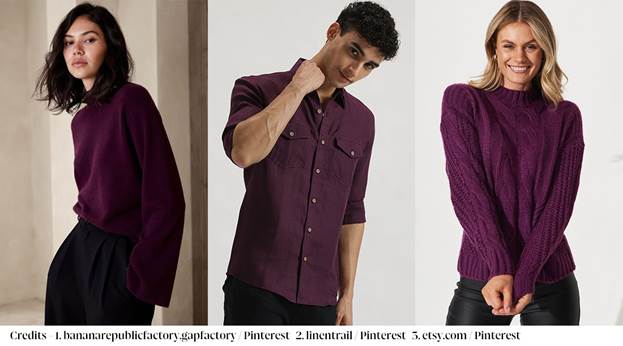 Feeling a bit regal? Plum is the way to go! This rich, deep colour adds a luxurious touch to your outfits. Imagine a plush plum velvet dress for a night out or a cozy sweater for a casual day. Wear it on its own or layer it with warm neutrals for a cozy, sophisticated look that’s fit for a queen! Plum also looks amazing with metallics, so don’t hesitate to shine!