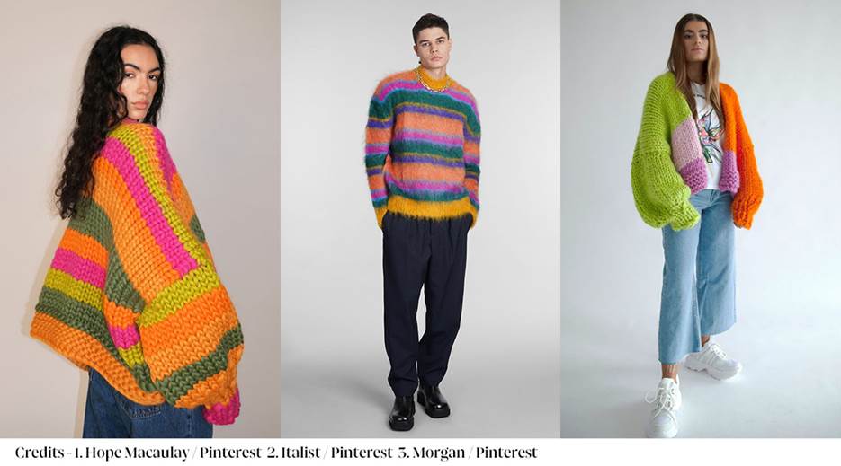 Women: A chunky and colourful, oversized knit looks great with a mini skirt or layered over a dress also you can rock in wide leg pants. Add knee-high boots or ankle boots for added warmth and style.